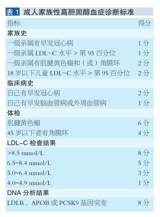 在筛查诊断方面,若个人或其家庭成员患 FH、成人血浆 LDL-C 水平≥ 8 mmol/L( ≥ 310 mg/dl)或儿童≥ 6 mmol/L、早发冠心病(男 <55 岁,女 <60 岁)、肌腱黄色瘤或早发心源性猝死,推荐儿童、成人和家庭成员筛查FH。根据荷兰血脂诊所网络标准(表1),若评分 >8 分,则可确诊 FH;若评分为 6~8 分,则极可能为 FH;若评分为 3~5 分,则可能为 FH;若评分为0~2 分,则不太可能是 FH。每组指标只能选择评分最高的因素。例如,当家族成员同时患冠心病、肌腱黄色瘤和高胆固醇血症时,家族史最高得分为2分。然而,若成年人存在高胆固醇血症而家族成员有早发冠心病,但无肌腱黄色瘤、儿童高胆固醇血症或相关基因突变时,家族史得分仍为 1 分。