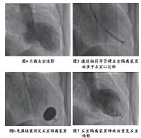 两位患者均进行了常规冠心病及心力衰竭二级预防治疗,术前超声和心脏CT筛查,两位患者分别选择75mm和85mm短脚心室隔离装置,分别使用14F和16F的指引导管。术中由麻醉科和心外科医师备台,如有紧急情况可做相应处理。术前三天阿司匹林300mg Qd。手术采用局麻。穿刺右侧桡动脉,进行左室造影(右前斜,角度由术前中心实验室提供)(图4)及右股动脉造影。穿刺右股动脉置入14F或16F鞘管,于左心室内置入6F猪尾导管,沿猪尾导管置入2.6m Amplatz Extra Stiff导丝,保留导丝,撤出猪尾导管,沿保留导丝将14F或16F指引导管(内有扩张器)放至左室心尖部后,撤出扩张器和导丝。在体外水槽内将心室隔离装置安装于输送导管内,注意充分排气,经输送导管通过指引导管将隔离装置放至心尖部,经左室造影和超声心动(经胸或经食道)确认隔离装置的脚已经位于心尖部后(图5),固定输送导管,后撤指引导管并充盈球囊固定隔离装置(图6),时间1分钟后逆时针旋转5圈释放。复查左室造影(图7)及超声心动,处理穿刺血管,完成置入术。术后阿司匹林100mg Qd和华法林抗凝1年,维持INR2-3。
