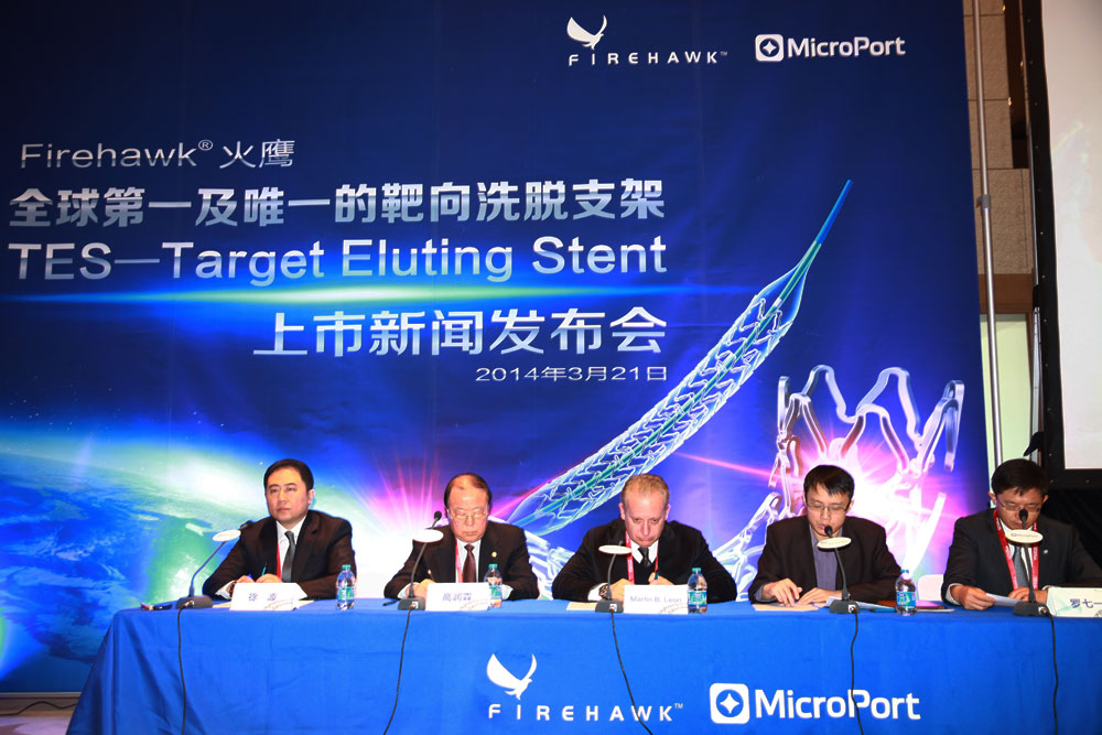 在第十二届中国介入心脏病学(CIT)大会期间,由中国本土企业上海微创医疗器械(集团)有限公司自主研发的新一代针对冠心病介入治疗使用的Firehawk®(火鹰)冠脉雷帕霉素靶向洗脱支架系统获准上市新闻发布会在上海召开。Firehawk®(火鹰)创下了数个中国第一乃至世界第一。首先,它是全球首个单面刻槽工艺支架;其次,它达到了支架有效载药量全球最低的“零冗余”标准;第三,围绕它展开的TARGET系列研究是我国第一个严格遵循国家食品药品监督管理局(CFDA)颁布的《冠脉药物支架临床试验指导原则》进行的上市前研究;第四,它是我国第一个与世界最领先心脏支架雅培XIENCE V支架进行大规模随机入组对照研究证明等效性的国产支架;第五,它是第一个有可能基于支架设计达到缩短介入术后双联抗血小板治疗的冠脉支架。