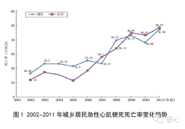 2002~2011 年,急性心梗死亡率总体上升较快(图1)。从2005 年开始,农村急性心梗死亡率呈现快速上升趋势,至2011 年已连续 3 年超过城市,2011 年急性心梗死亡率农村为48.53/10 万,城市为47.36/10 万。