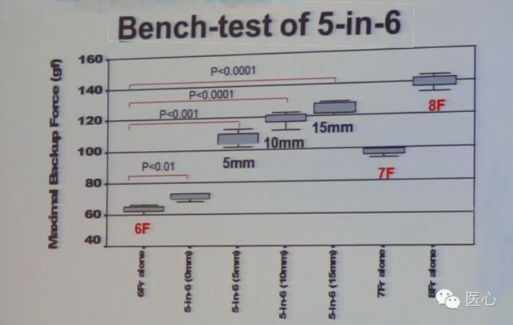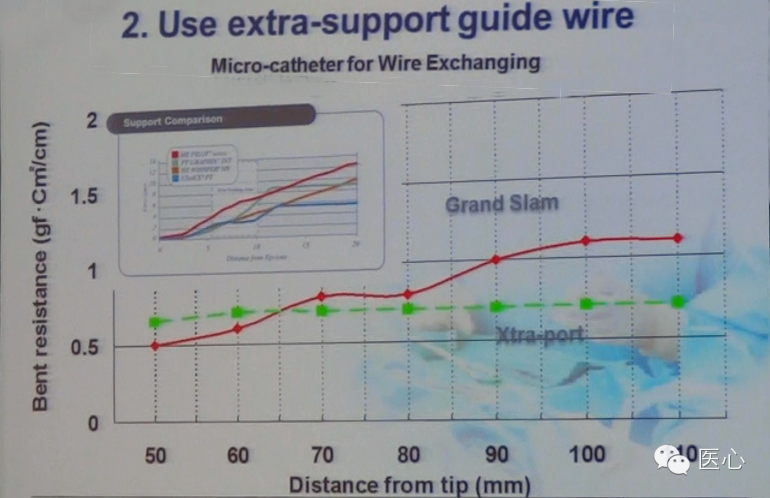 当初始钢丝支撑力不足时,则应使用强支撑力指引导丝。其特点为Body部分硬度十分强,但头端较软。由于不同厂商导丝头端硬度、头端设计不同,选取时应根据医师操作经验来加以区分。下图为导丝交换配合导管治疗中,导丝支撑力数据。