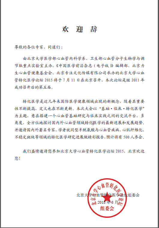 我们盛情邀请您参加北京大学心血管转化医学论坛2015,北京欢迎您!