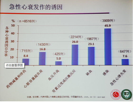 中国心衰患者注册登记研究(China-HF)是正在进行的一项前瞻性、多中心、国内最大规模的住院心衰患者登记研究,涉及100多家医院。根据截至2014年底提交至数据中心的88家医院的8516 例心衰患者的临床资料,该研究新近公布了病因、临床特点和治疗情况初步分析的结果:中国住院心衰患者最主要的病因是高血压(54.6%),其次是冠心病(49.4%),非缺血性心肌病(26.9%),糖尿病(21.7%),瓣膜性心脏病(17.6%),先天性心脏病(3.5%);急性心衰发作的诱因包括感染(45%)、劳累过度(26.0%)、心脏容量超负荷(16.8%)与缺血(23.1%)等。