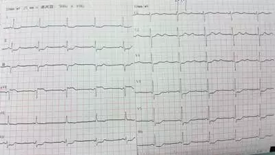入院心电图: 窦性心律,室性早搏,Ⅰ、aVL、V4-V6导联ST段压低、T波倒置。