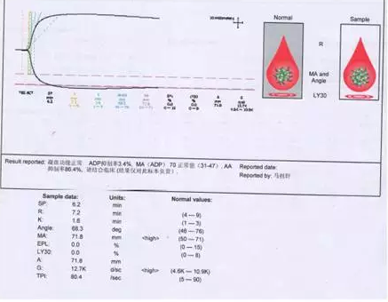 随访结果: 由于既往应用氯吡格雷后血小板抑制率欠佳,且患者出现支架内再狭窄及闭塞,术后换用替格瑞洛治疗。5天后出院时复查血栓弹力图:阿司匹林及替格瑞洛对血小板的抑制率分别为85%和44.7%,ADP-MA 48.6 mm。1月后复查阿司匹林及替格瑞洛对血小板的抑制率分别为62.8%和48.8%,MA-ADP 44.3。术后1年,一直服用阿司匹林+替格瑞洛,病情稳定,未发生并发症。