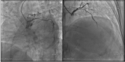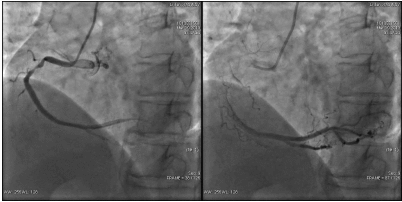 手术过程: 于LCX、RCA植入支架两枚。效果良好,未见残余狭窄,TIMI血流3级。