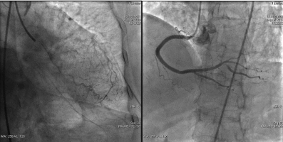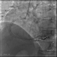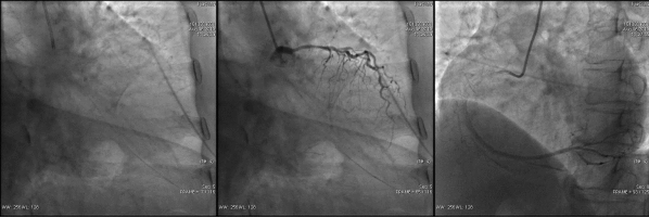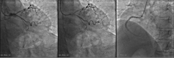 造影结果: LAD病变较前未见明显变化,RCA次全闭塞,LCX支架内100%闭塞。