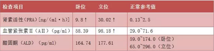患者入院后血钾水平正常,入院前曾行肾上腺CT未见异常,立位及卧位肾素-血管紧张素-醛固酮系统(RAAS)结果如下表2,不支持原发醛固酮增多症。