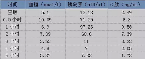 其他检查:(1)血管彩超显示双侧颈动脉、锁骨下动脉及椎动脉未见异常;经颅多普勒超声(TCD)未见异常,脑电图未见异常;(2)双下肢深静脉彩超未见血栓;(3)经胸超声心动图显示轻度二、三尖瓣关闭不全,右心室射血分数正常;(4)卧位氧饱和度94%,立位氧饱和度96%;(5)延时OGTT试验(见表1)。