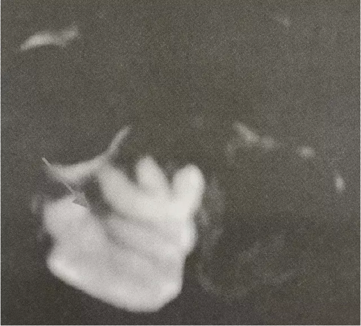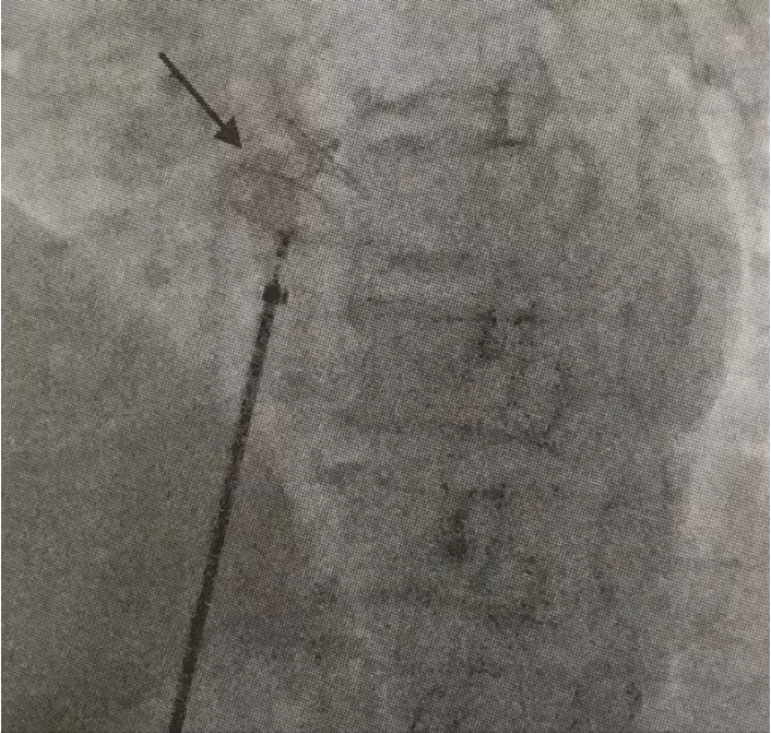 图4. 经皮卵圆孔未闭封堵术 图示为封堵器关闭卵圆孔(所指为卵圆孔封堵器)