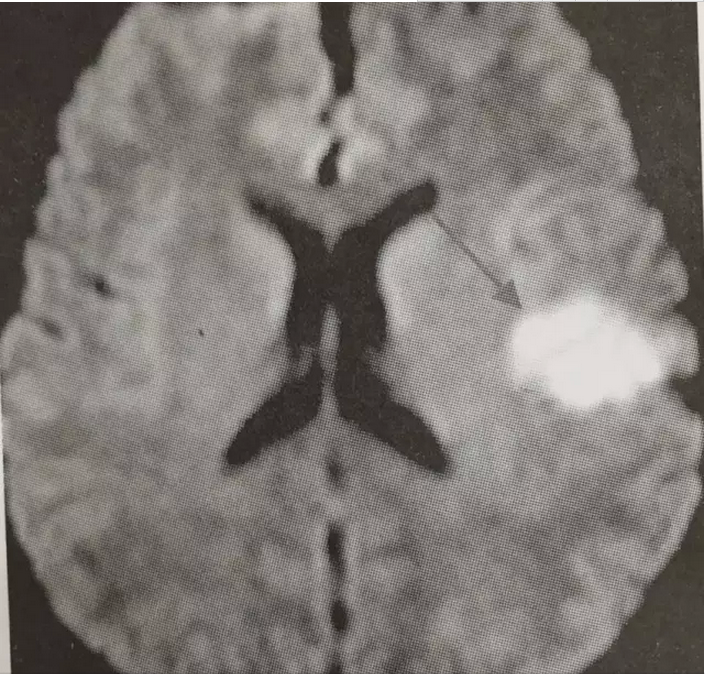 图2. 患者第二次脑栓塞MRI示左侧大脑半球梗死(箭头所指)