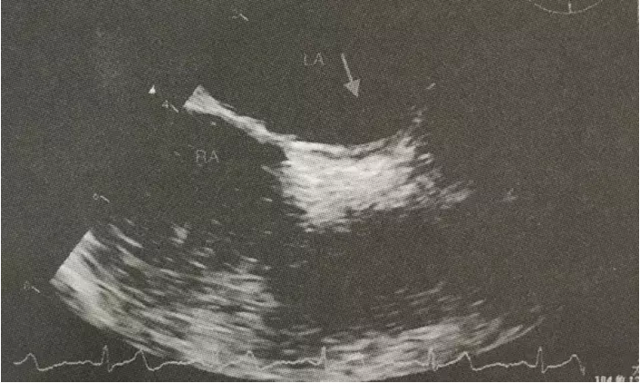 图3. 经食管超声心动图加右心声学造影 右心房(RA)内可见声学对比剂,左心房(LA)内可见少量声学对比剂(箭头所指)
