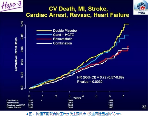 HOPE-3研究有两个联合主要终点,即由CV死亡、非致死性心肌梗死(MI)和非致死性卒中组成的主要复合终点1和由CV死亡、非致死性MI、非致死性卒中、心脏骤停复苏、心力衰竭和动脉血运重建组成的复合终点作为研究的主要复合终点2。