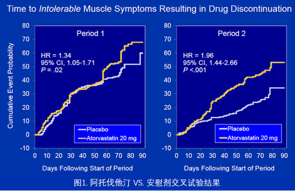 这两张曲线图(图1)显示患者在2个10周中分别出现肌肉不耐受症状从而被迫停药的时间。在第1个10周(左图),50天至60天的区间内两条曲线几乎重叠,提示无差异;危险比1.34。而在交叉后的第2个10周(右图)中,阿托伐他汀组显著陡峭,危险比2具有显著意义。