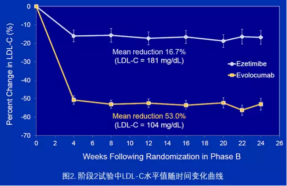 阶段2试验的主要终点与次级终点分为2个时间设置下的LDL降幅。结果显示,ezetimibe降幅16.7% vs. evolocumab降幅超过50%(第24周时,evolocumab 52.8%、ezetimibe 16.7%;22周与24周的均值体现为evolocumab 54.5% vs. ezetimibe 16.7%)。两组达到十分巨大的差异。同时需要指出,evolocumab组的脂蛋白a下降21%,而ezetimibe组没有变化。