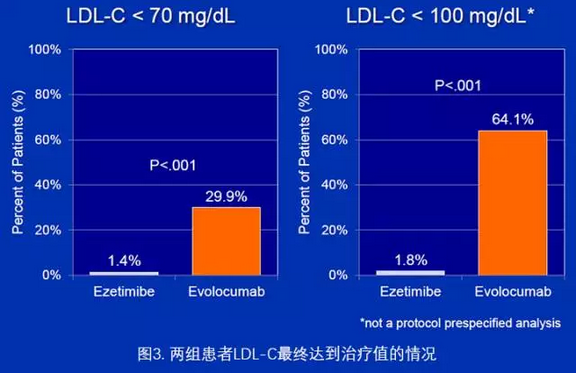 LDL随时间的变化显示在图2,ezetimibe组患者治疗后的LDL平均水平值维持于181 mg/dl;evolocumab组降低至104 mg/dl,达到将近53%的降幅。再看LDL最终的治疗情况(图3),1/3的evolocumab患者最终的LDL值降至70 mg/dl以下,2/3的evolocumab患者最终低于100 mg/dl;而ezetimibe患者中均只有少于2%的患者达到这些治疗值(P均<0.001)。