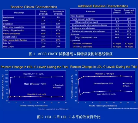 ACCELERATE试验是一项随机双盲试验,研究分为三期,在全球近540个心脏中心开展,共纳入12,000多名高危严重的心血管患者。入选者随机每天接受130 mg的Evacetrapib或安慰剂至少18个月,主要终点为心血管死亡、心梗、卒中、血运重建或不稳定心绞痛入院复合终点。所有患者同时也接受标准治疗方案:96.4%患者用他汀进行基线治疗,15.2%患者用至少一种非evacetrapib脂质修饰剂。
