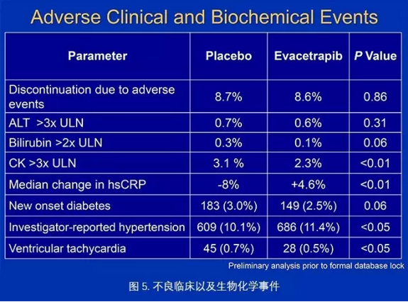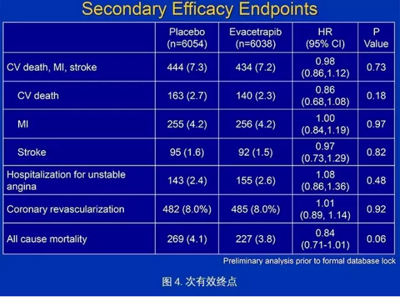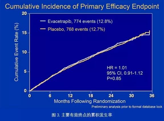对比安慰剂组,使用Evacetrapib组患者平均降低LDL水平37%,提升HDL水平可达130%。但在主要终点方面,两组之间并未有统计学差异,换句话说,Evacetrapib对胆固醇方面的良好作用并未转化到任何减少主要终点事件上。2015年10月12日,在数据监测委员会以主要复合终点临床无效的理由的建议下提前终止。