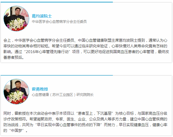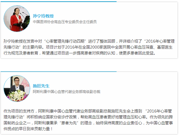 2016年4月8日,由中国心血管健康联盟作为指导单位、心血管健康(苏州工业园区)研究院主办、阿斯利康中国支持的“2016年心率管理先锋行动”项目正式启动。