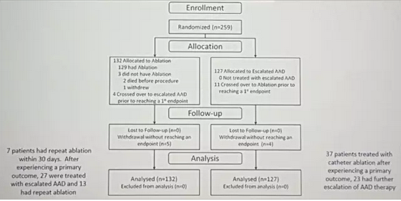 患者以1∶1的比例随机分入消融组(127例)与药物治疗组(132例)。随机分层处理的标准是按照中心,以及当采用胺碘酮或者非胺碘酮的AAD治疗时是否发生限定的心律失常。导管消融组在入组后两周内实施。药物治疗组如过去应用索他洛尔,则更换为胺碘酮;如果已经应用胺碘酮,则增加治疗剂量,或者是在大剂量胺碘酮基础上加用美西律。研究平均随访27.9个月,一级终点为全因死亡、ICD恰当放电和室性心律失常电风暴(图1)。