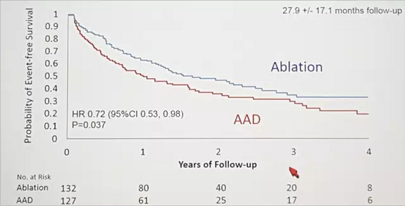 ▲ 图2. 相对于药物治疗组,导管消融组能够降低一级终点事件发生率