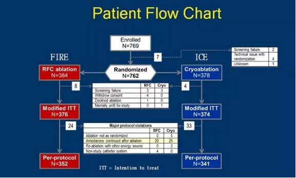 FIRE and ICE研究是目前为止对比冷冻球囊消融和射频消融治疗阵发性房颤最大型的、多中心、前瞻性、随机对照研究。该研究开始于2012年,研究涉及第一代和第二代冷冻球囊消融导管和射频消融导管,平均随访时间1.5年。该研究证实了对于有症状的阵发性房颤患者,冷冻球囊消融在安全性及有效性上,不劣于射频消融,且手术时间更短。