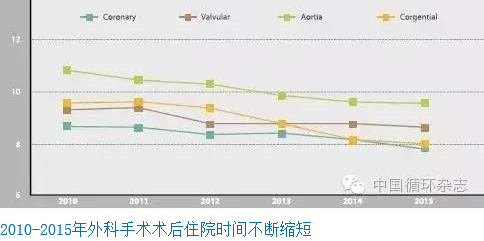 近6年来,主动脉手术患者术后平均住院天数逐年下降,2015年降至9.0天。