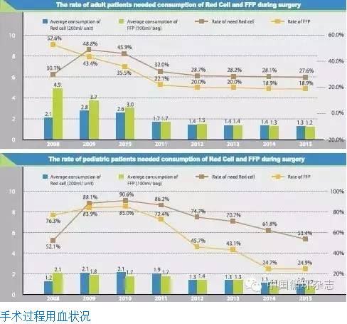 4. 医院严格把控用血指征,血制品使用比例、人均红细胞及血浆用量呈持续下降趋势。2015年成人、小儿手术血制品使用率及使用量均降至历年最低。