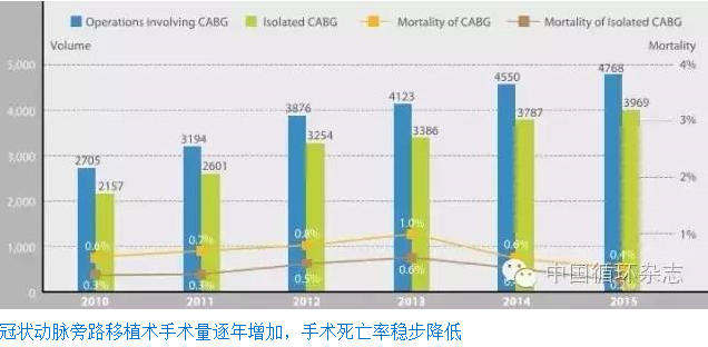 6. 冠心病比重逐年上升,2015年共完成冠状动脉旁路移植术4768例。手术死亡率已降至0.4%,术后住院时长已降至7.8天。