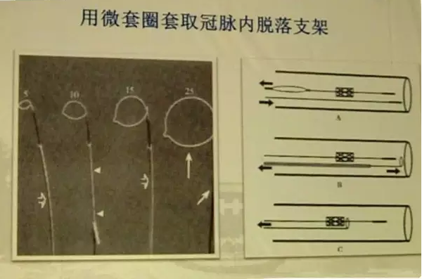 目前较为常用。一般是将支架拉至升主动脉或降主动脉后,用套物圈将支架套住,再利用对侧导管将支架取出。有时可以直接套住支架,支架较短时也可以直接套住钢丝,将钢丝在对侧取出,进而带出支架。