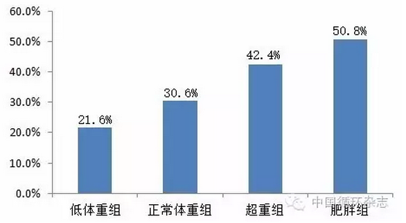 注:低体重定义为体重指数(BMI)<18.5kg/m2,正常体重为BMI在18.5~23.9kg/m2,超重为BMI在24.0~27.9kg/m2,肥胖为≥28.0 kg/m2