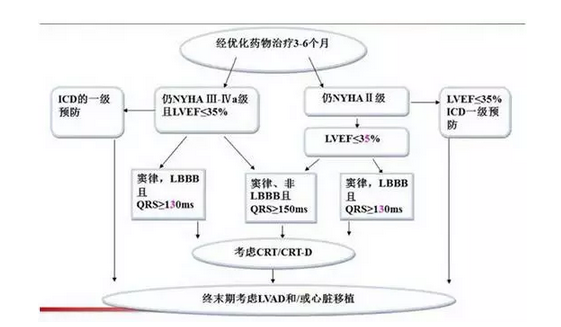 2014年中国心衰指南中,将CRT适应证扩大到了NYHA Ⅱ级患者,但对QRS波宽度及形态也有了更严格的限制。该指南中推荐NYHA Ⅱ级患者的适应证为:(1)左室射血分数(LVEF)≤30%,伴左束支传导阻滞(LBBB)及QRS≥150ms,推荐置入CRT,最好是心脏再同步化并置入心脏复律除颤器(CRT-D)(Ⅰ,A)。(2)LVEF≤30%,伴LBBB且130ms≤QRS<150ms,可置入CRT或CRT-D(Ⅱa,B)。(3)LVEF≤30%,非LBBB但QRS≥150ms,可置入CRT或CRT-D(Ⅱb,B);非LBBB且QRS<150ms,不推荐CRT(Ⅲ,B)。同时,指南也对心衰患者的非药物治疗流程做出了推荐(如图1所示)。