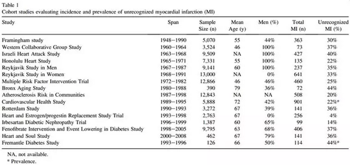 图 1 表格引用自 Prevalence, Consequences and Implications for Clinical Trials of Unrecognized Myocardial Infarction. Am J Card;2013;111:914e9,18