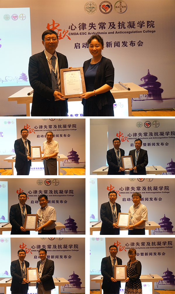 会上,石丽英主任向张澍教授颁发了聘书,正式聘任张澍教授为中欧心律失常及抗凝学院院长;张澍教授为朱俊教授颁发了副院长聘书,为黄德嘉、黄从新、杨新春、吴立群等专家颁发了委员聘书,为范桂娟老师颁发了秘书聘书。