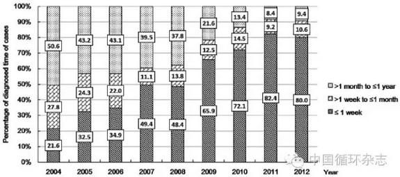 此外,研究还显示,早期检出先心病比例逐渐升高。在2004-2006年,仅有不到1/3的先心病病例在出生后1周内检出,而在2010-2012年这一比例约上升为4/5(图2)。