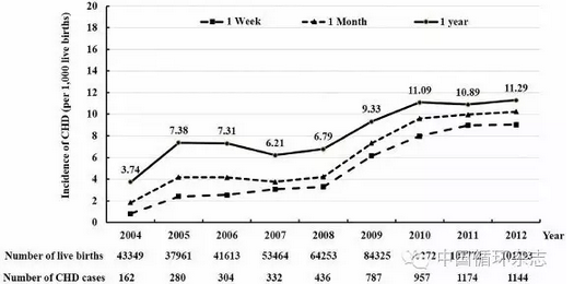 研究者发现,从2004年开始,先心病发病率逐渐上升,在2010-2012年渐趋稳定(图1)。