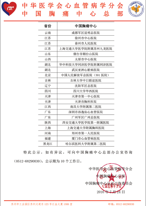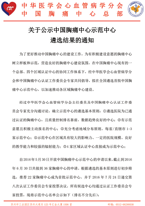 CSC中国胸痛中心总部公示中国胸痛中心示范中心遴选结果