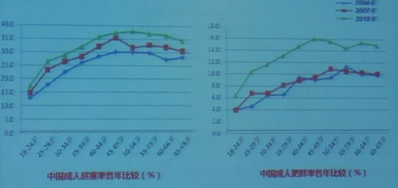 中国成人心血管代谢危险因素的流行趋势日益严峻。中国成人超重与肥胖率于2004 / 2007 / 2010 年逐年升高。44-55岁时超重与肥胖率最高,60岁以后有逐渐下降趋势。其中,男性40-49岁时中心型肥胖率最高,女性60-69时中心型肥胖率最高。女性中心型肥胖患者病率各年龄段均高于男性,男性差异随年龄增加而逐渐增大。