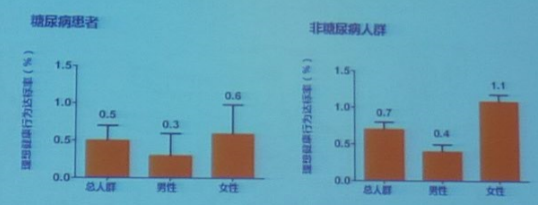 中国慢性及其危险因素糖尿病治疗与控制监测现状显示,糖尿病知晓率为30.1%,既往临床已经明确诊断糖尿病我的患者占所有糖尿病患者的比例;治疗率为25.8%,目前正在使用降糖药物的糖尿病患者占所有糖尿病患者的比例;控制率为39.7%,HbA1c<7.0%糖尿病患者占所有使用降糖药物治疗患者的比例。