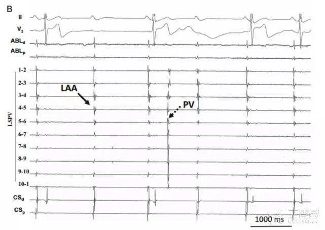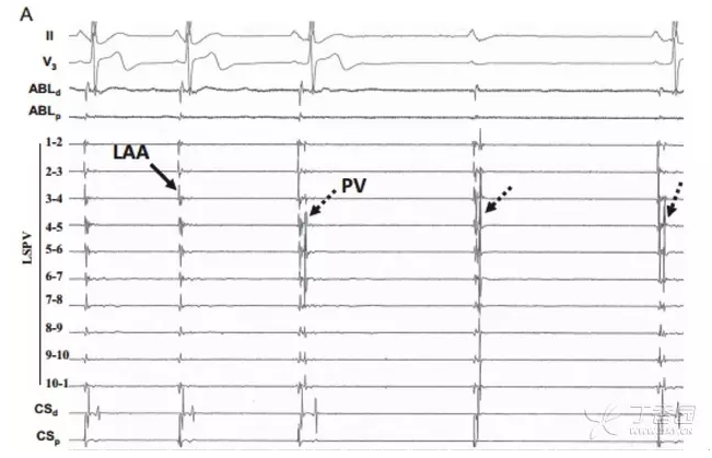 图 2 腺苷实验中显示肺静脉传导恢复,并指导进一步的射频消融。 LAA:左房电位;PV:肺静脉电位