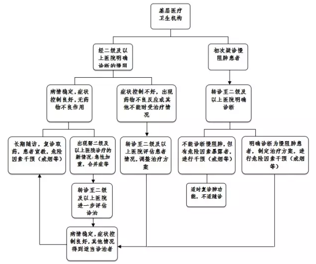 由于慢阻肺首诊大多在基层医院,所以社区医生对慢阻肺的诊断和治疗负有重要使命。主要包括慢阻肺预防、高危及疑似患者的识别、患者教育、稳定期治疗、康复治疗和长期随访。为保证慢阻肺诊疗工作质量,应将疑似患者及时转到二级及以上医院,及早明确诊断,同时启动随访管理和双向转诊机制。
