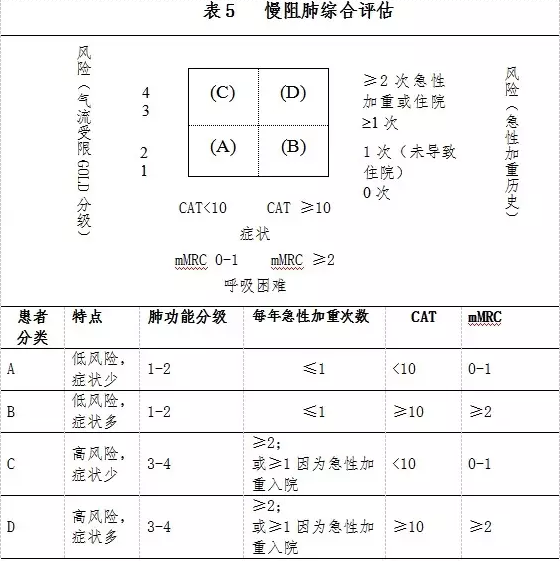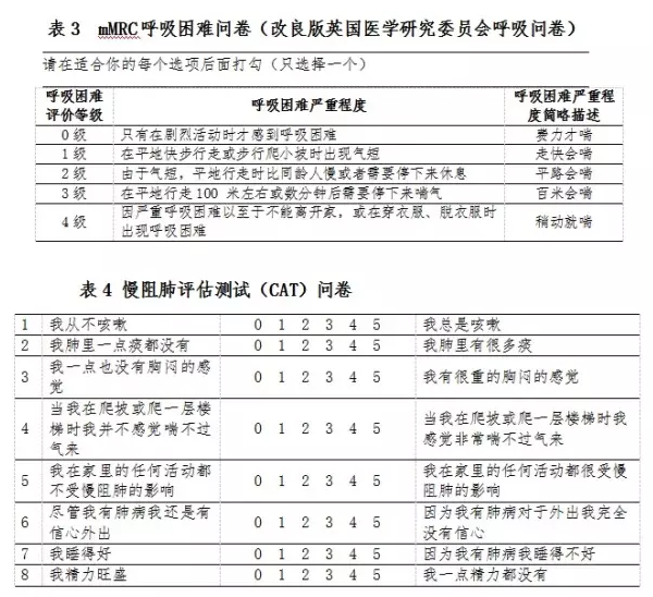 慢阻肺综合评估包括气流受限程度(表2)、对患者呼吸症状的影响(表3)、对患者生活质量的影响(表4)、远期不良风险(如急性加重、住院或死亡),从而用以确定疾病的严重程度,指导治疗(表5)。