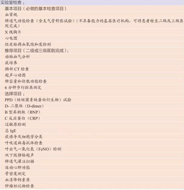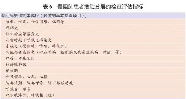 根据患者病情需要及医疗机构实际情况,恰当选择相应的检查项目,具体分为基本项目、推荐项目和选择项目,详见“慢阻肺患者危险分层的检查评估指标”(表5)。