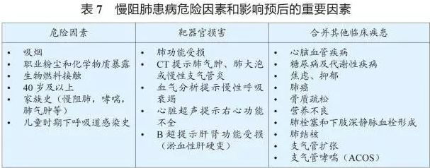 对初诊患者应通过全面询问病史、体格检查、各项辅助检查以及相关问卷评估,完成慢阻肺的综合评估,找出影响慢阻肺预后的危险因素、评价并存其他临床疾患等因素,并据此进行慢阻肺危险分层,量化评估预后(表7)。
