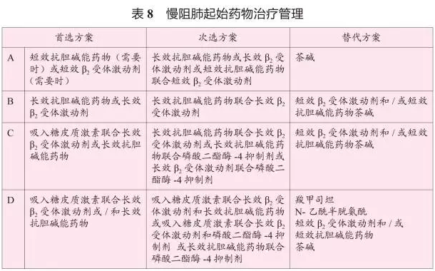 药物治疗应遵循以下原则,优先选择吸入药物,坚持长期规律治疗,个体化治疗。依据患者临床情况、药物的适应症和禁忌症、药物的可获得性以及卫生经济学评估等选择适宜的治疗药物(表8)。