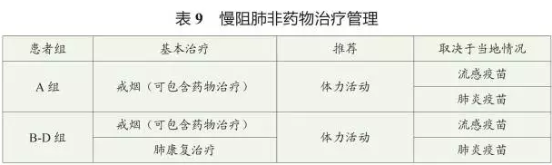 慢阻肺的非药物治疗包括戒烟,疫苗,肺大泡切除术、肺减容手术,康复治疗,氧疗,无创呼吸机辅助通气治疗等(表9)。