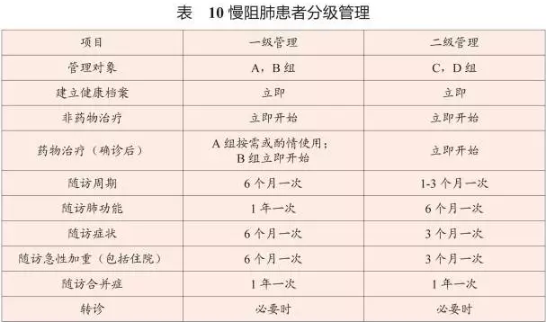 对慢阻肺患者按照综合评估的分组进行分级管理(表10)。