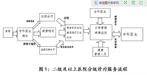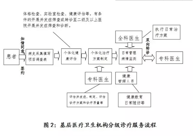 二级及以上医院负责疾病临床诊断,按照疾病诊疗指南与规范,制定个体化、规范化的治疗方案;实施患者年度专科体检,并发症筛查;指导、实施双向转诊;定期对基层医疗卫生机构医疗质量和医疗效果进行评估。其中,二级医院负责急症和重症患者的救治,对基层医疗卫生机构进行技术指导和业务培训。三级医院负责疑难复杂和急危重症患者的救治,对二级医院、基层医疗卫生机构进行技术指导和业务培训。