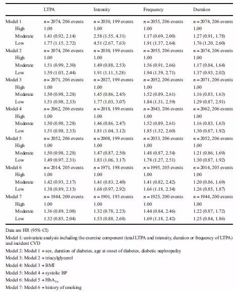 表1.Cox回归分析所示的LTPA、运动强度、频率及持续时间不同之T1DM患者发生CVD时间的HR。