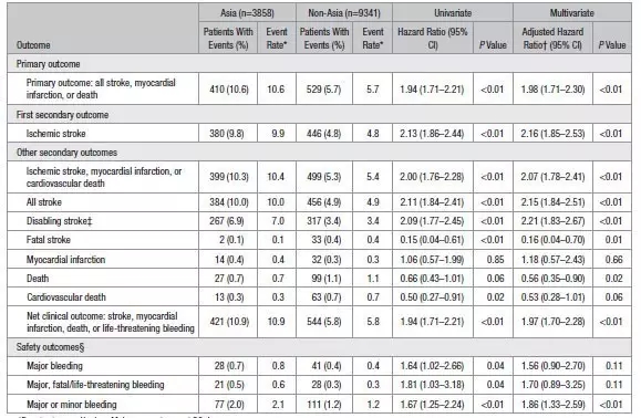 那么为什么亚洲人群的研究结果与欧美人群不同呢?这主要考虑几个方面:首先,亚洲患者的复发风险高,有数据显示亚洲人群卒中的复发率是欧美人群的2倍。亚洲患者复发风险高的原因目前比较公认的包括以下几点:①亚洲患者较非亚洲患者的发病年龄更低,而低年龄组不同人种复发率的差异更为明显;②虽然亚洲患者的血管事件风险因素相对少,但是二级预防较差,尤其是抗凝、降压及血糖控制方面;③卒中发病病因机制的差异,如亚洲人群大动脉粥样硬化型的比例更高一些。另外,亚洲患者出血风险高。亚洲患者出血风险高的因素主要考虑以下几个原因:①亚洲人群体重相比非亚洲人群较低,体重指数(BMI)也较低;②在缺血性脑血管事件中,亚洲人群TIA的住院率更低,住院患者中主要是缺血性卒中。而我们都知道缺血性卒中后发生出血的风险是高于TIA的,因此亚洲人群发生缺血性脑血管事件后出血风险更高。